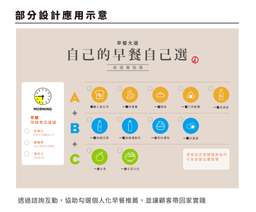 在這次專案中,我們從使用者的日常作息出發,設計實用且易懂的早餐飲食&保健食品規劃建議表,並搭配輕鬆幽默的警語貼紙,讓營養師根據個人化的數據說明時搭配使用,最後在顧客離開前,提醒他們規劃表與貼紙的使用方法,期待讓當下的體驗更深刻,同時延長對顧客生活的影響力。