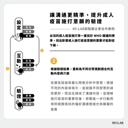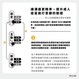 台灣的成人疫苗施打率一直低於WHO建議的標準,RE:LAB 曾經和「Sanofi」合作,透過一場社群的溝通實驗找出「影響成人施打疫苗意願的要素」,除了驗證過去作法的效力,同時也加入新的想法一起嘗試,最後分析蒐集到的互動成效與量化問卷回饋,產出後續溝通策略與互動的建議,以下我們直接就兩個步驟一一說明: