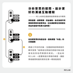 為了讓創業者更容易找到適合的資源,全國創新創業總會將中央到地方政府提供的相關資源整理成完整的懶人包,並以表格的形式在網頁上呈現。不過得到的反應卻不如預期,所以和 RE:LAB 一起討論可以如何重新設計,這次的專案從一場共創的工作坊作為起點,從「互動」設計的調整,到實際「驗證」,最後回頭調整「設定」中的未來溝通策略。以下我們直接就兩個步驟一一說明: